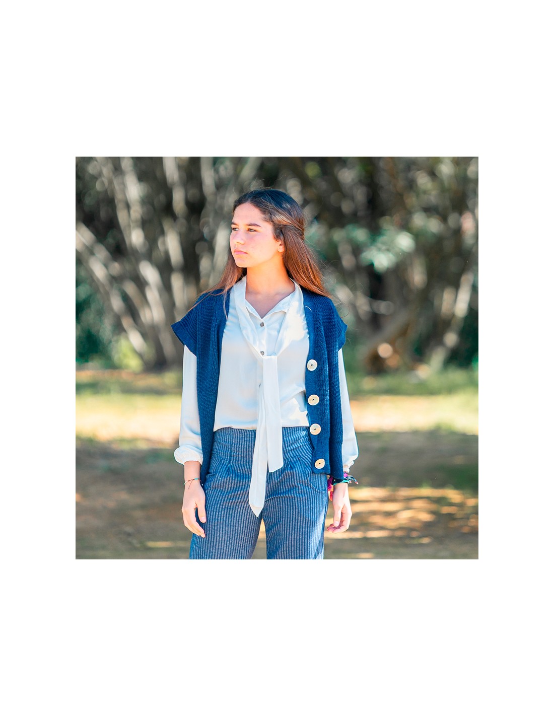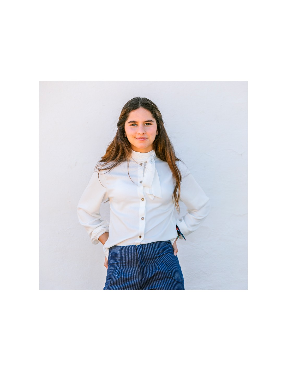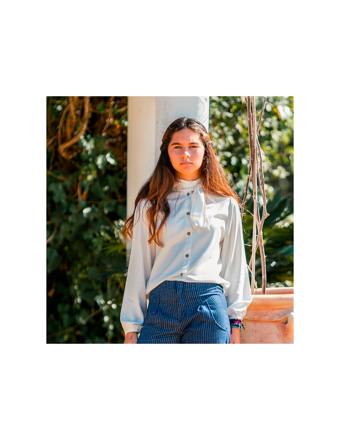 Confeccionada en viscosa ligera con mucha caída, esta blusa es pura sofisticación: su lazada fina en el cuello aporta ese aire romántico y parisino que nunca pasa de moda. Minimalista y delicada, es una pieza versátil que se adapta a distintos estilos y momentos.