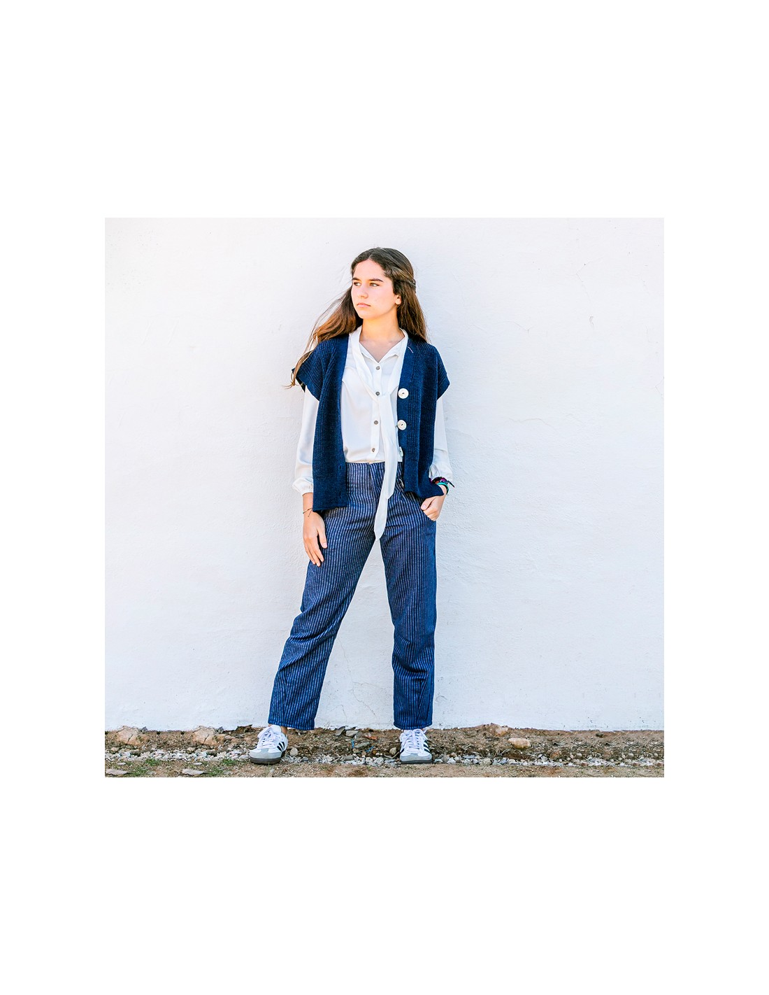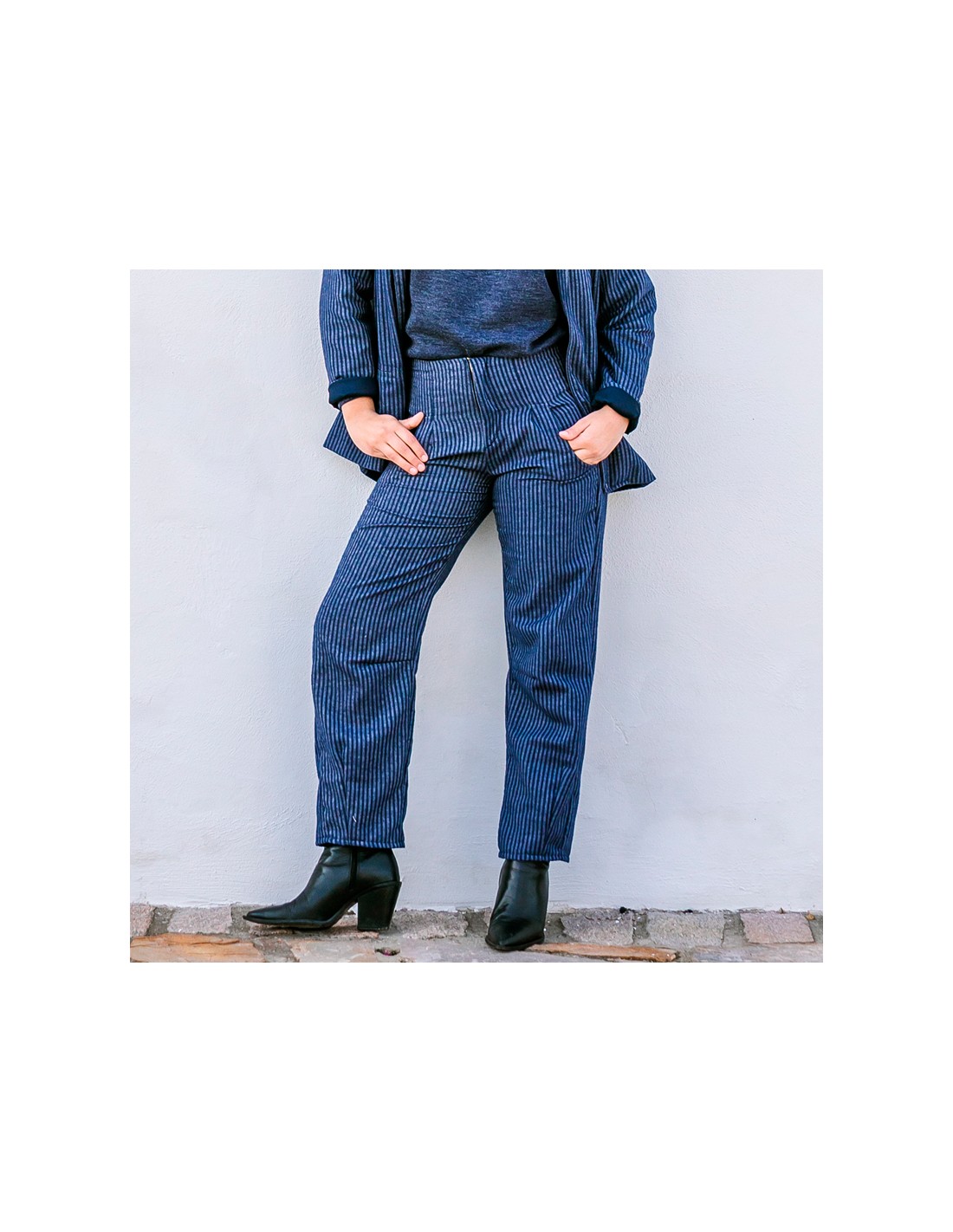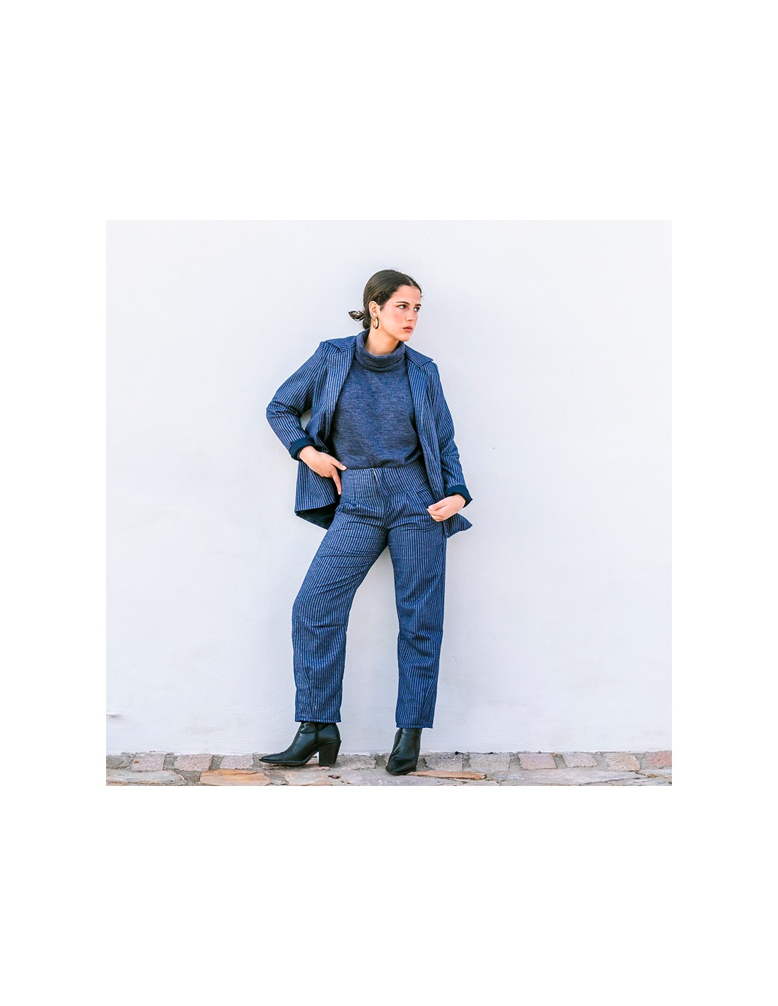 Este pantalón de rayas diplomáticas se inspira en el tailoring tradicional, adaptado a la silueta femenina. El corte recto con cintura, pinza y cremallera aporta estructura y elegancia, mientras que el bolsillo redondo añade un toque moderno y delicado, evitando rigidez.