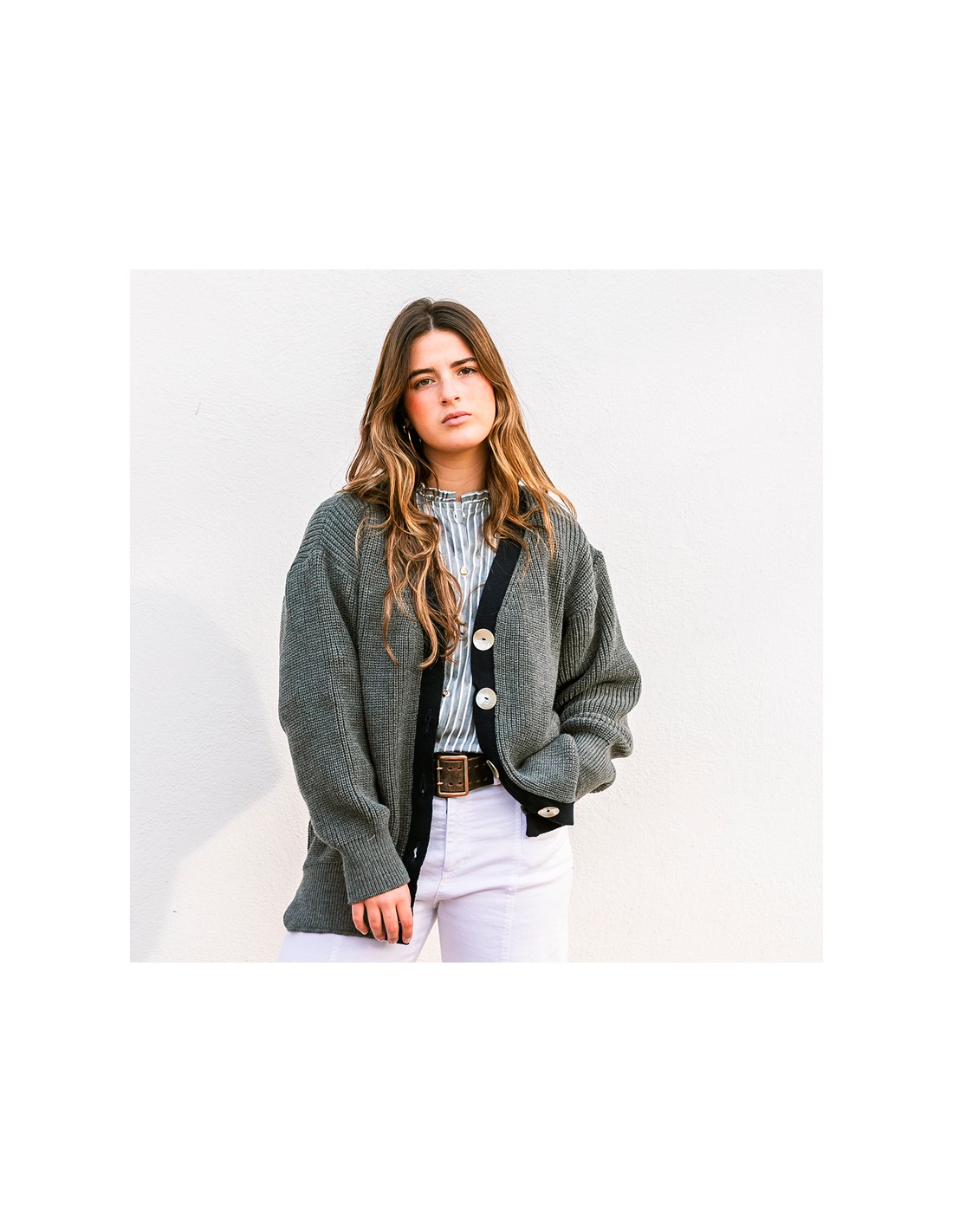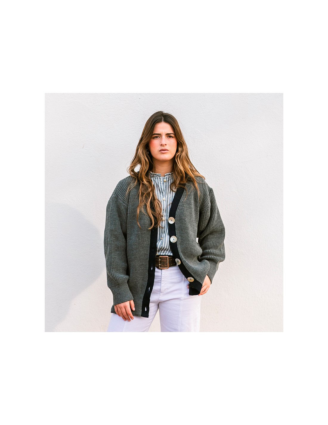 Una chaqueta de punto que combina comodidad, estilo y sofisticación. Su color gris marengo aporta un fondo neutro fácil de combinar, mientras que la botonadura en contraste añade personalidad y un toque preppy chic. Los botones maxi en nácar elevan la prenda con un detalle elegante y distintivo.