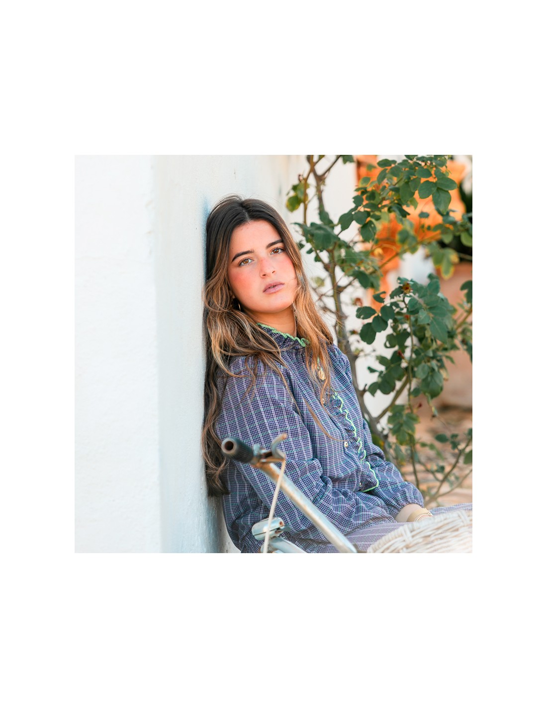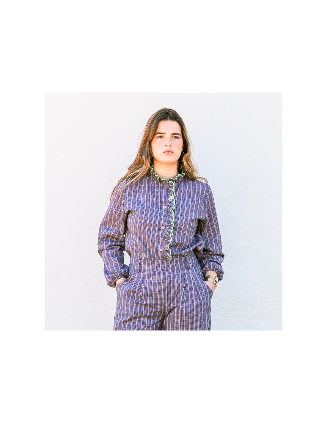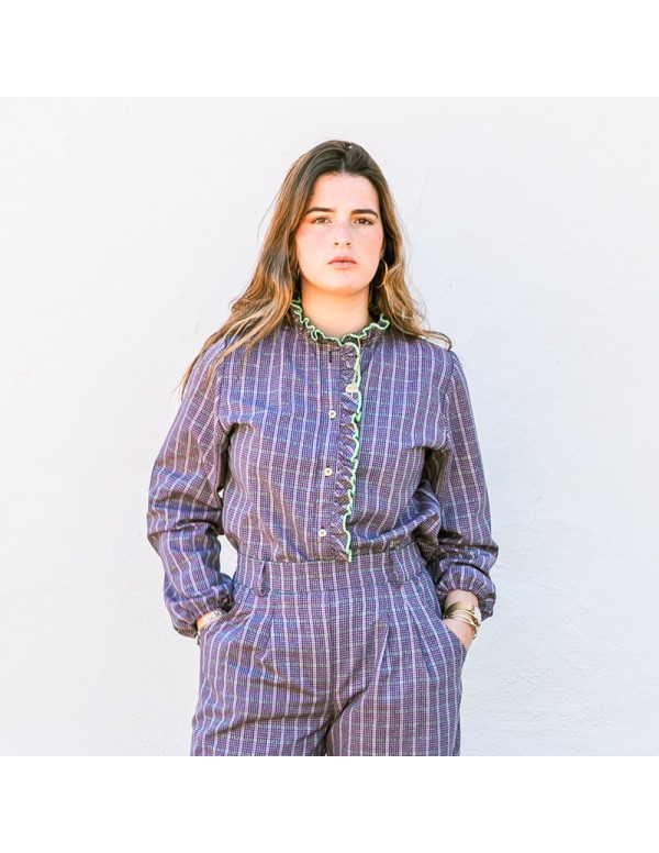 Una blusa que combina romanticismo moderno y sofisticación femenina. El tejido delantero en cuadros con hilo de lurex aporta un brillo sutil que da vida a la prenda, mientras que la botonadura con botones dorados pequeños añade un detalle elegante y refinado.