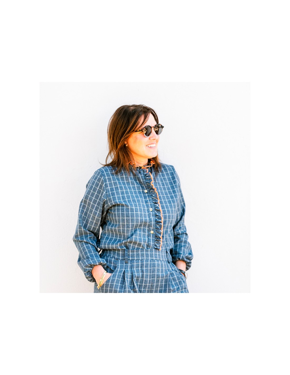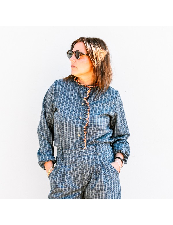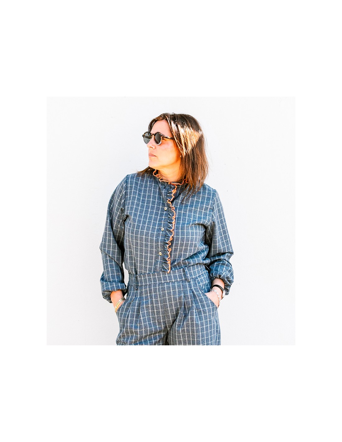 Una blusa que combina romanticismo moderno y sofisticación femenina. El tejido delantero en cuadros con hilo de lurex aporta un brillo sutil que da vida a la prenda, mientras que la botonadura con botones dorados pequeños añade un detalle elegante y refinado.